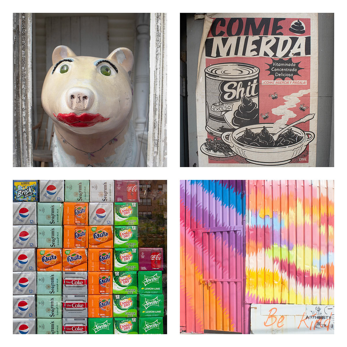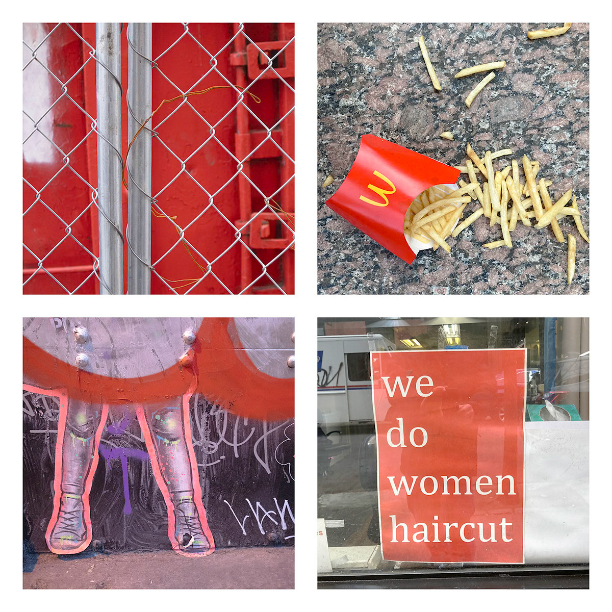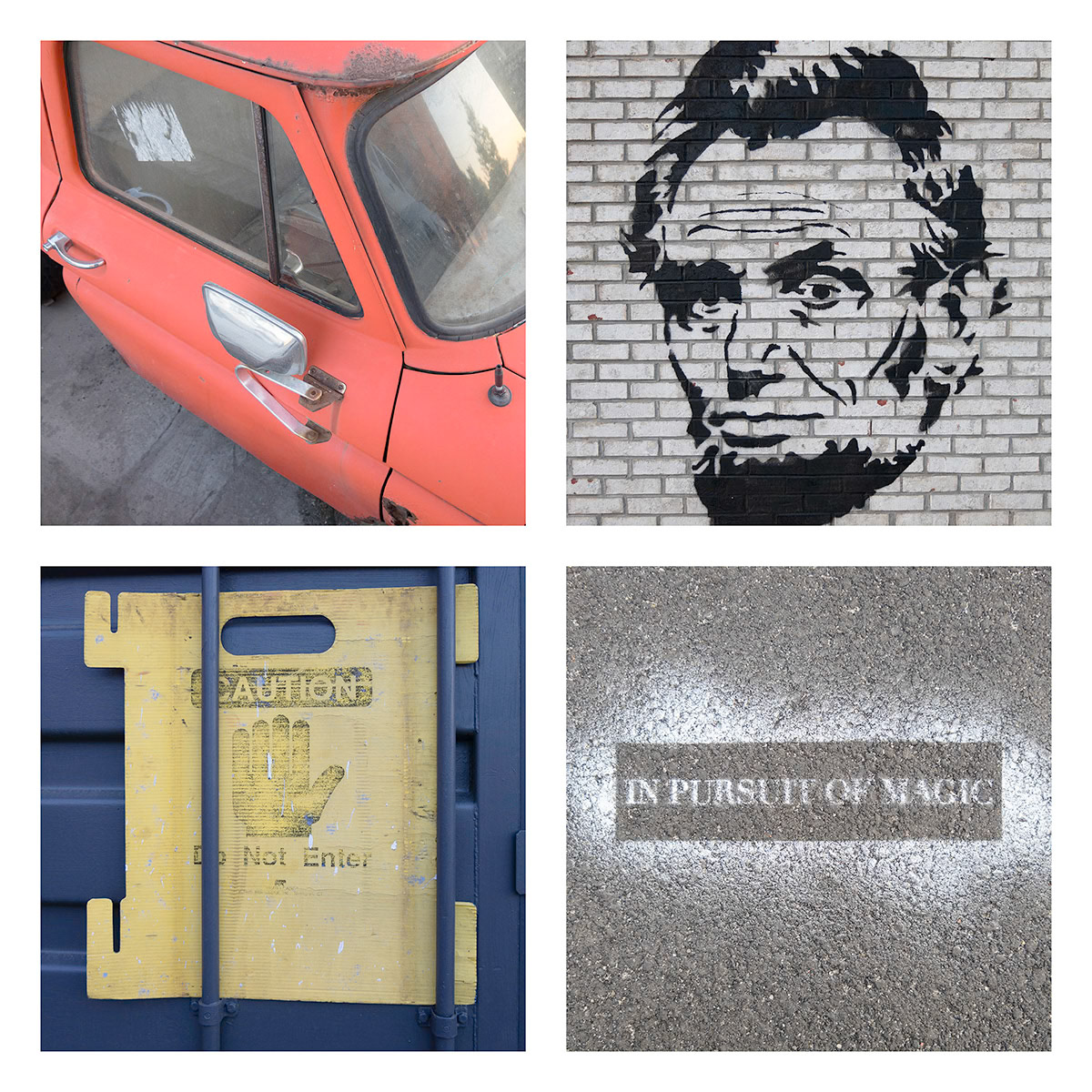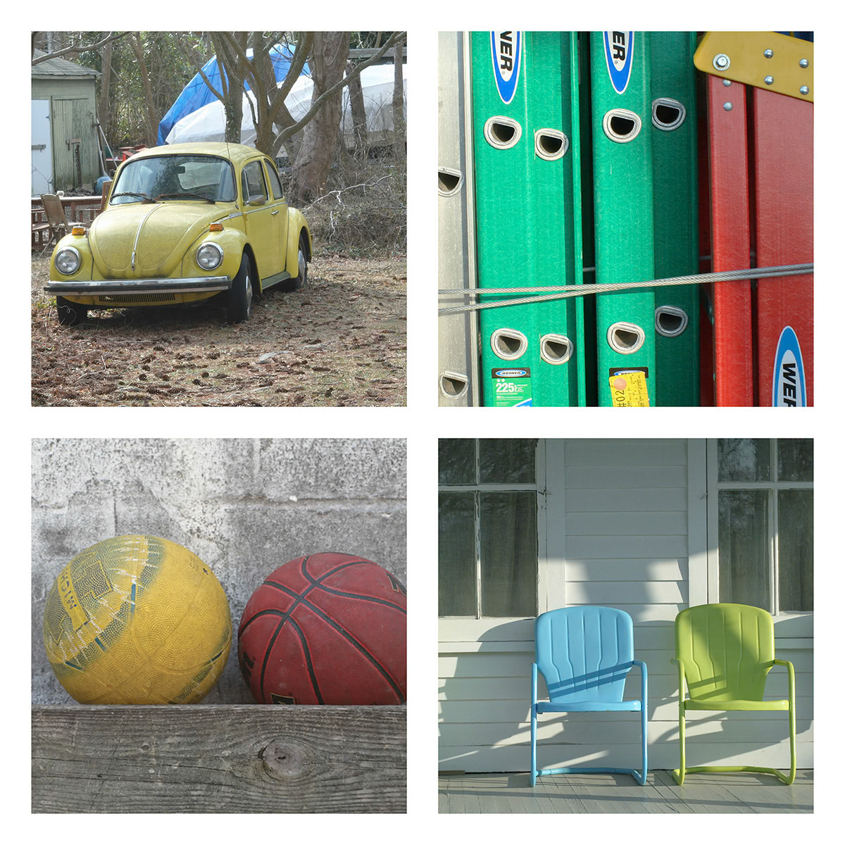 I continue an ongoing project of combining four images, typically found objects and artifacts are connected by theme, shape, or color. These composites present a narrative of a place, moment in time, or a thought.