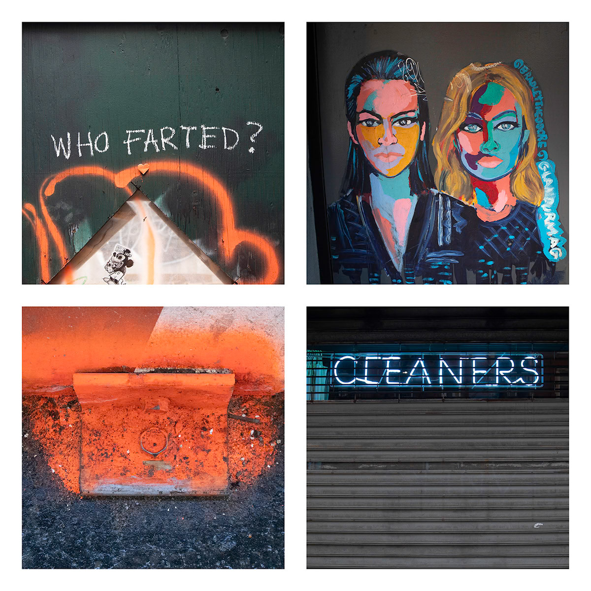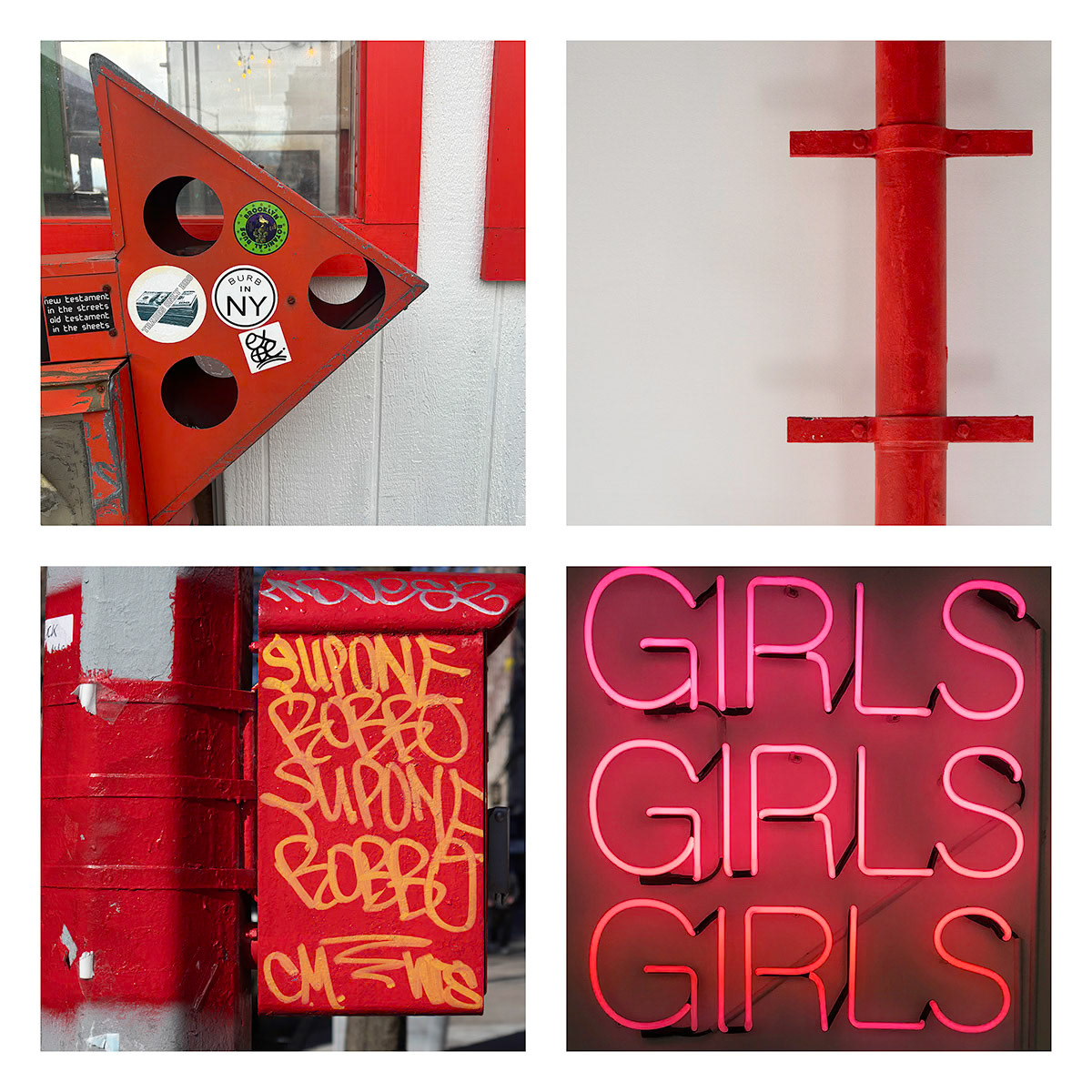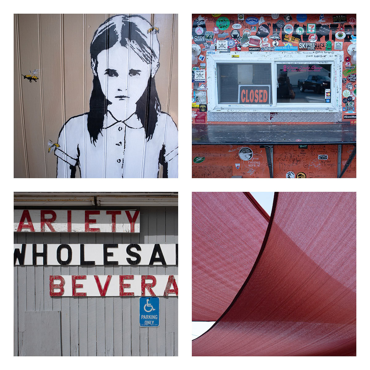 I continue an ongoing project of combining four images, typically found objects and artifacts are connected by theme, shape, or color. These composites present a narrative of a place, moment in time, or a thought.